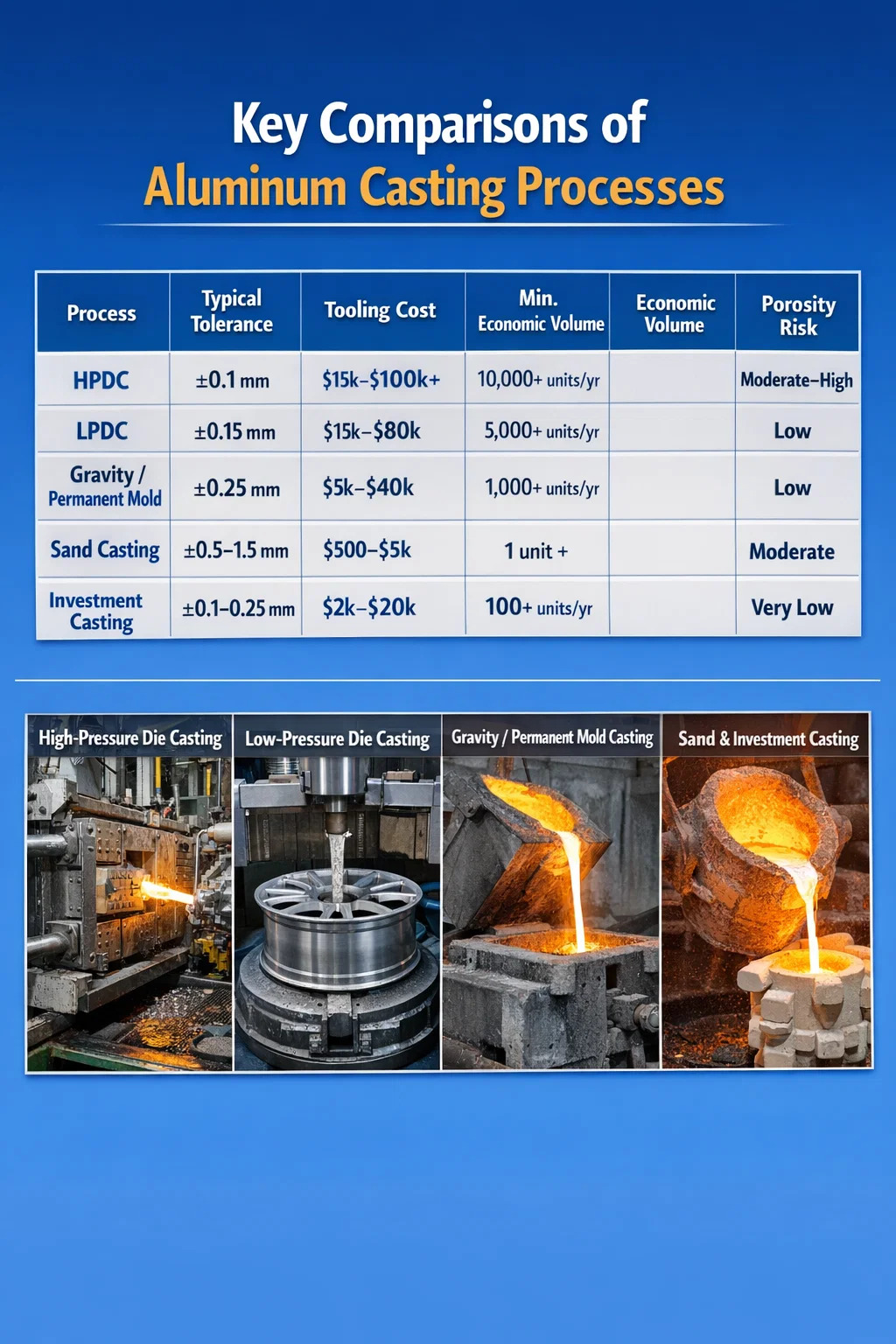 Přímý závěr pro každého, kdo hodnotí výrobní možnosti: pokud váš díl váží více, než potřebuje, pracuje v korozivním nebo tepelně náročném prostředí a musí být vyráběn v objemech nad zhruba 500 jednotek ročně, hliníkový odlitek téměř jistě překonává výrobu oceli, vstřikování plastů a tlakové odlévání zinku na základě celkových nákladů na díl. Zbytek tohoto článku přesně vysvětluje proč, s konkrétními údaji o procesech, slitinách, tolerancích a kontrole defektů.