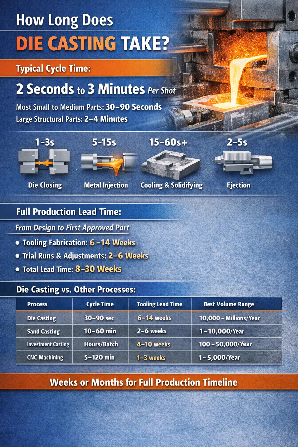 Tento údaj doby cyklu vypráví jen část příběhu. Než první dobrý díl sjede z linky, operace tlakového lití zahrnuje výrobu nástrojů (která může trvat 6–14 týdnů), nastavení stroje, předehřívání formy, zkušební snímky a ověření rozměrů. Od hrubého návrhu až po schválenou výrobní část se celá časová osa měří v týdnech nebo měsících, nikoli v sekundách.