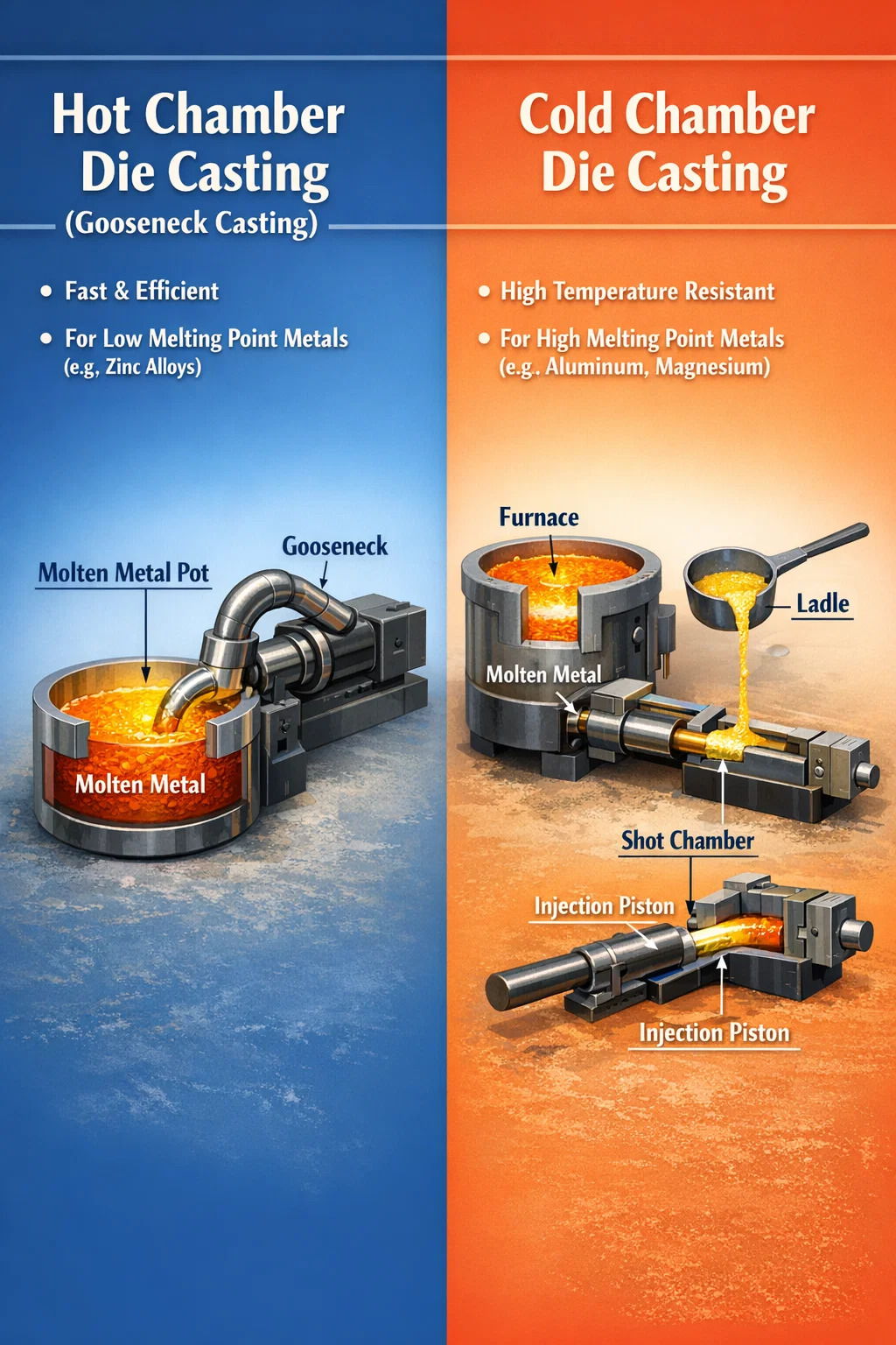 Ve světě lití pod tlakem Existují dvě hlavní kategorie podle toho, jak se kov taví a vstřikuje do formy: tlakové lití v horké komoře a tlakové lití ve studené komoře.