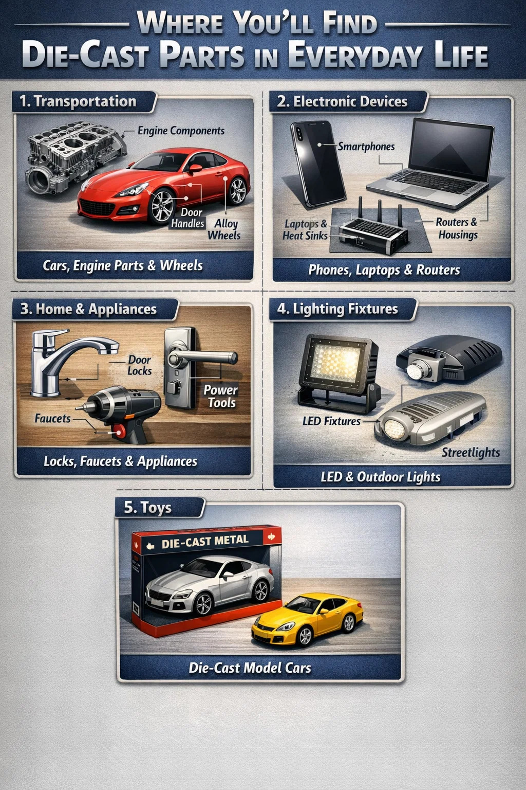 Odlévání pod tlakem se používá především k výrobě předmětů, které vyžadují odolnost, přesné tvary a hromadnou výrobu. Zde jsou některé z nejčastějších použití v našem každodenním životě: