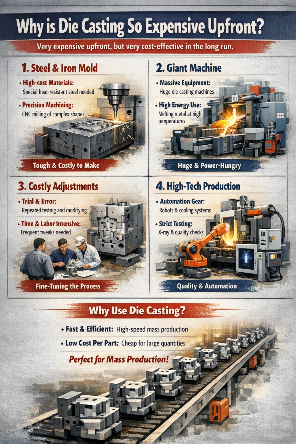 ve skutečnosti lití pod tlakem je skutečně proces, který je „velmi drahý předem, ale z dlouhodobého hlediska velmi nákladově efektivní“. Jeho vysoká cena se odráží především v počáteční investici. Tento proces můžeme rozdělit:
